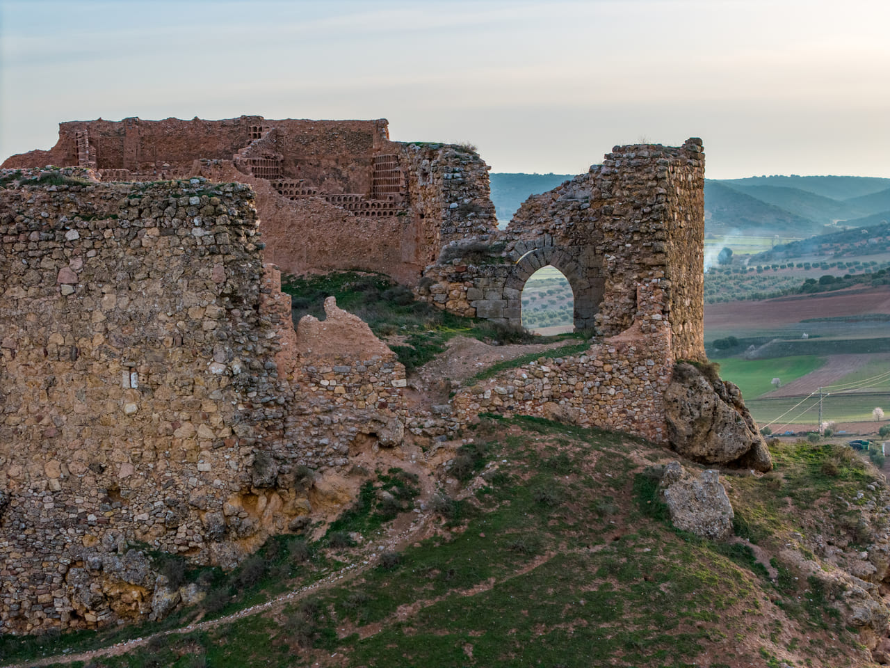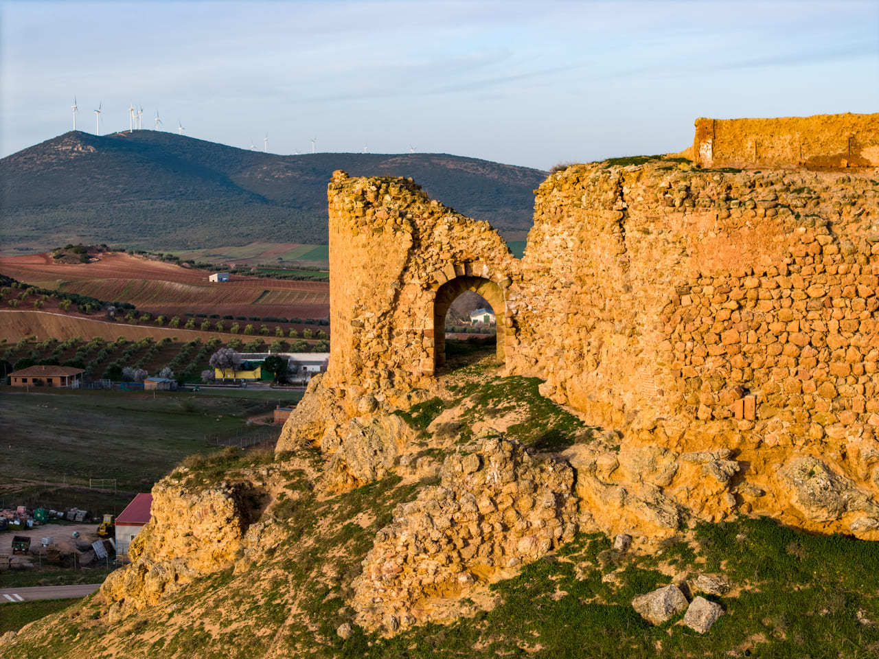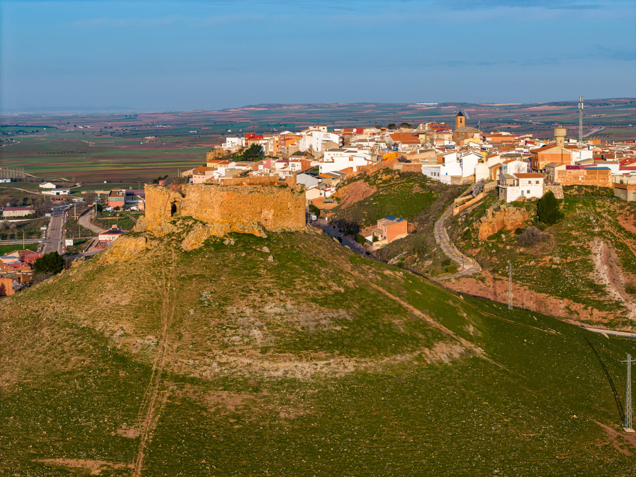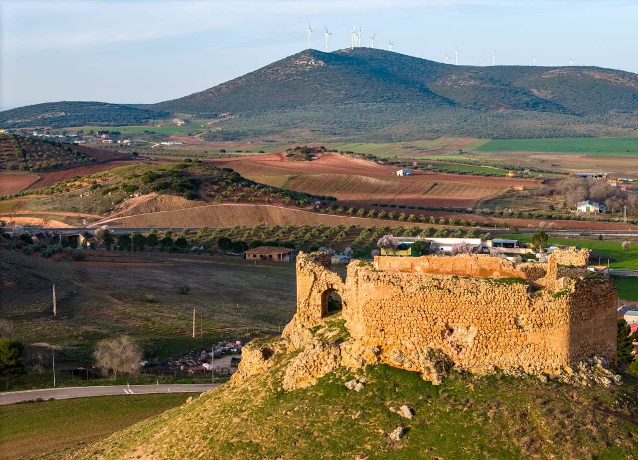 Su emplazamiento explica también su larga trayectoria histórica. La zona tuvo un valor estratégico desde la Antigüedad, vinculada al territorio de la ciudad iberromana de Laminium. En el cerro se documentan indicios de ocupación omeya y, ya en época cristiana, la plaza se consolida tras las campañas posteriores a las Navas de Tolosa: a inicios del siglo XIII pasó a la Orden de Santiago. En 1241 se organiza la encomienda y en 1243 Alhambra obtiene fuero, reforzando su papel comarcal. La fábrica del castillo se sitúa entre mediados y el último tercio del siglo XIII, con usos administrativos y de control territorial durante toda la Baja Edad Media.